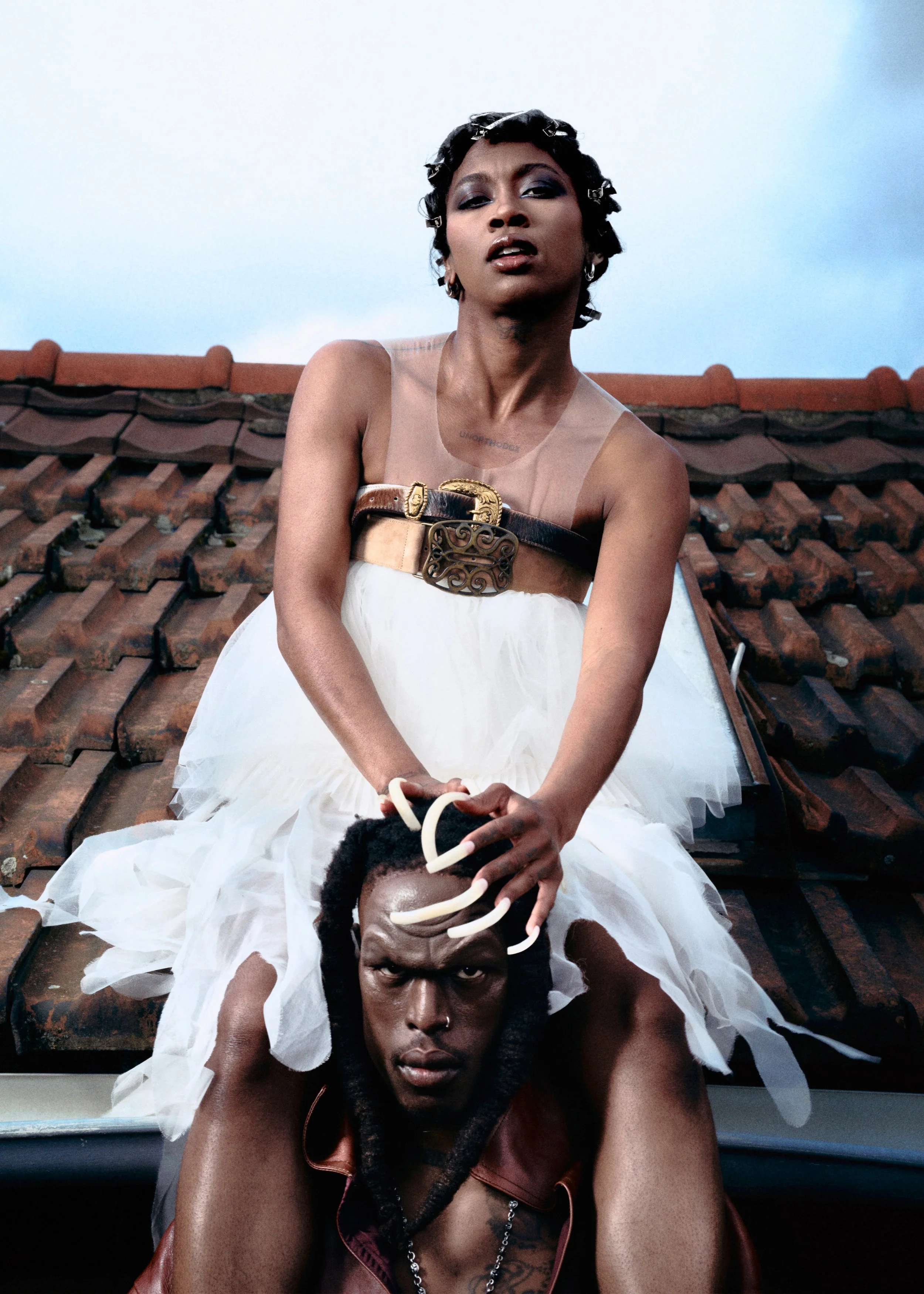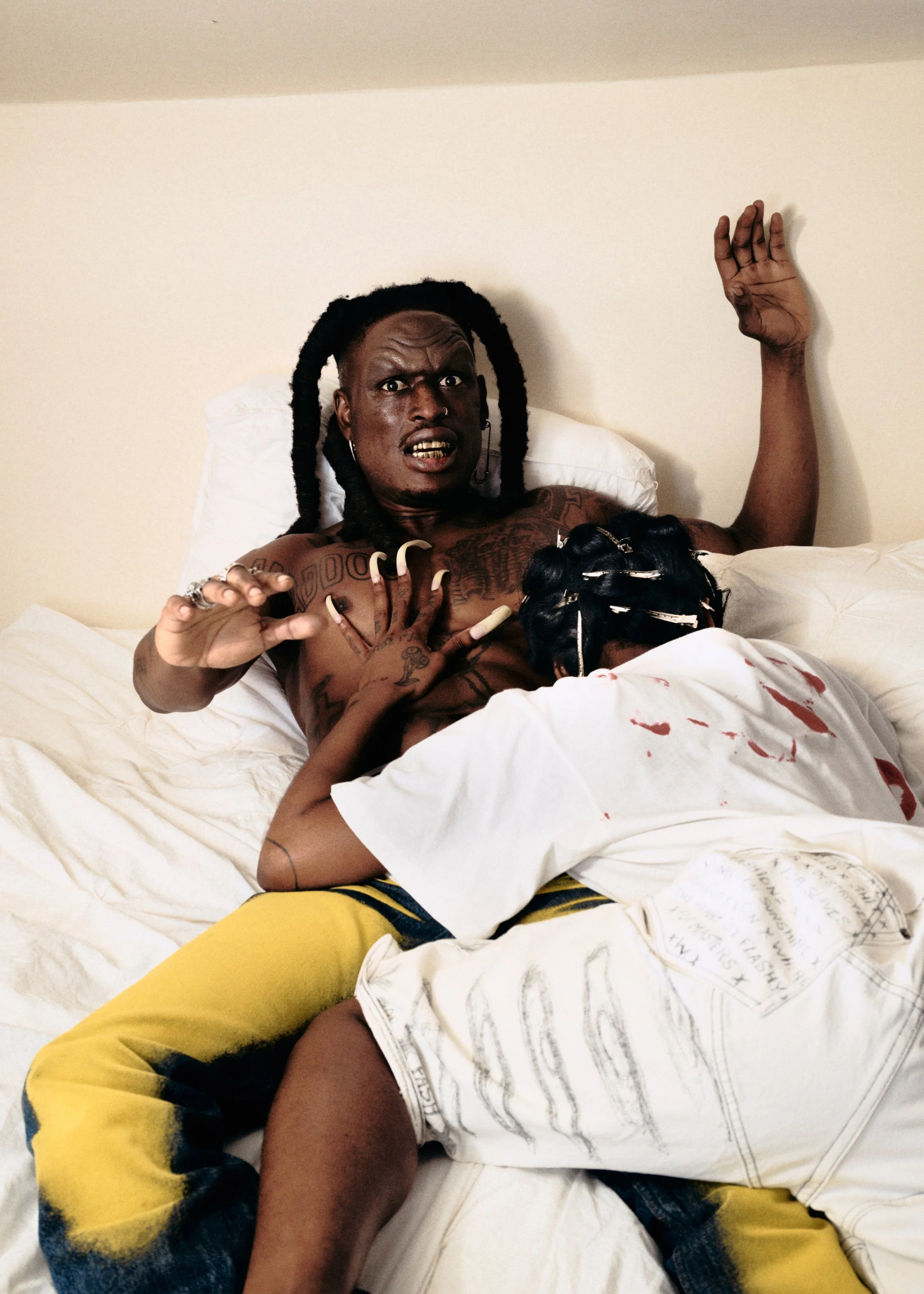 Minzly and Billyracxx wear total SOLÈNE LESCOUËT, Minzly wears Empty Behavior x Chen Peng heels, Billyracxx wears his own Rick Owens boots
