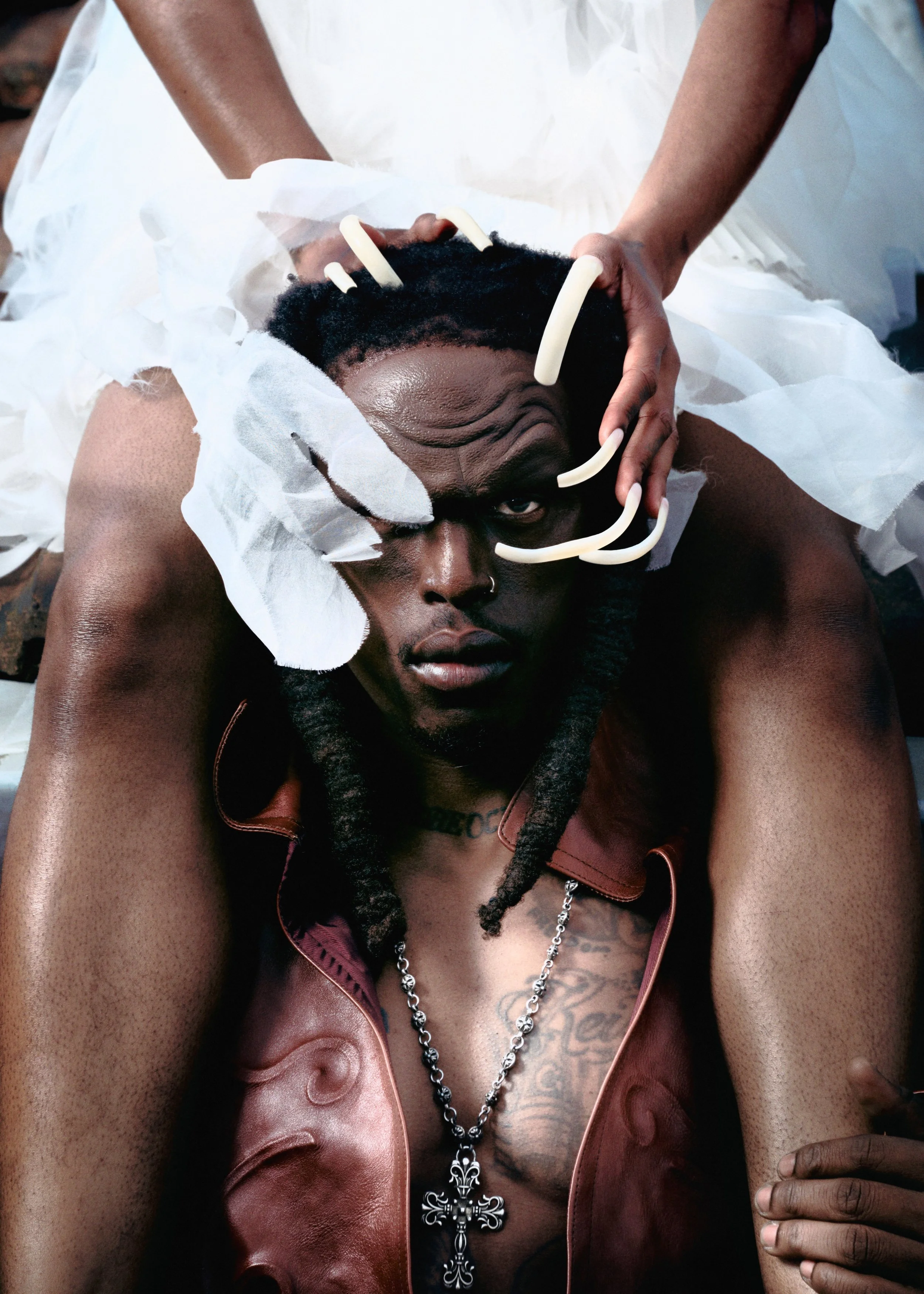 The couple’s collaboration spans fashion, music, and visual storytelling. “Seeing her work with other artists pushes me to elevate my own craft,” Billyracxx says. With upcoming projects—from a new album to KMEWORLD statement garments—they remain in sync professionally and personally. “I’m a character in the world she builds,” he adds.